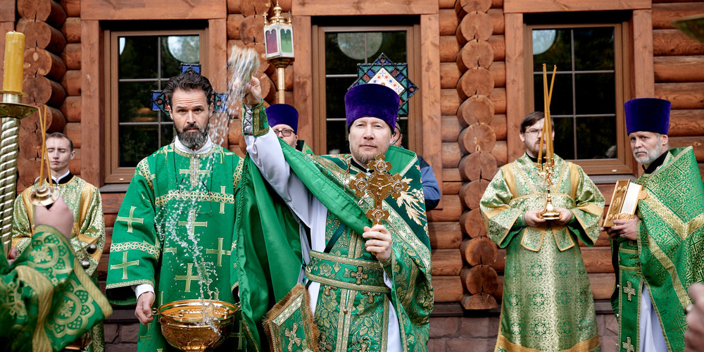 Затем владыка Силуан и сослужащие священники совершили великую вечерню праздника Пятидесятницы с чтением коленопреклонных молитв и Крестный ход.