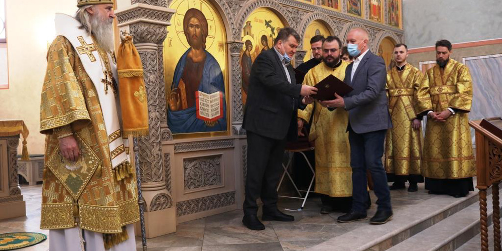 По окончании богослужения владыка Феогност обратился к собравшимся с архипастырским словом, в котором поблагодарил всех за совместную молитву, поздравил настоятеля и прихожан со знаменательным событием и вручил награды особо потрудившимся в деле возрождения храма и приходской жизни.