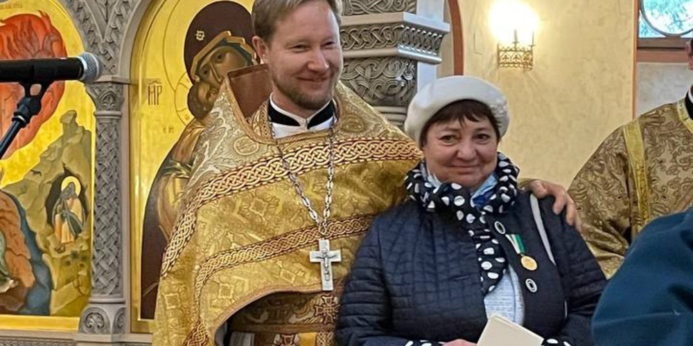 Затем состоялось награждение медалью Русской Православной Церкви «Патриаршая благодарность» во внимание к самоотверженному труду по борьбе с короновирусной инфекцией заведующей поликлиникой №6 ГВКГ им. Бурденко Натальи Соловьевой и сотрудницы храма, старшей сестры Сестричества Татьяны Власовой.
