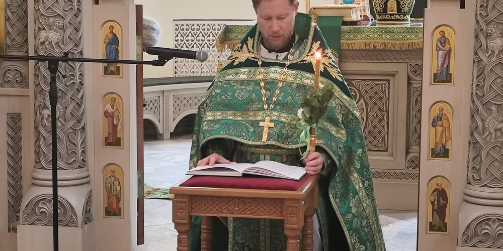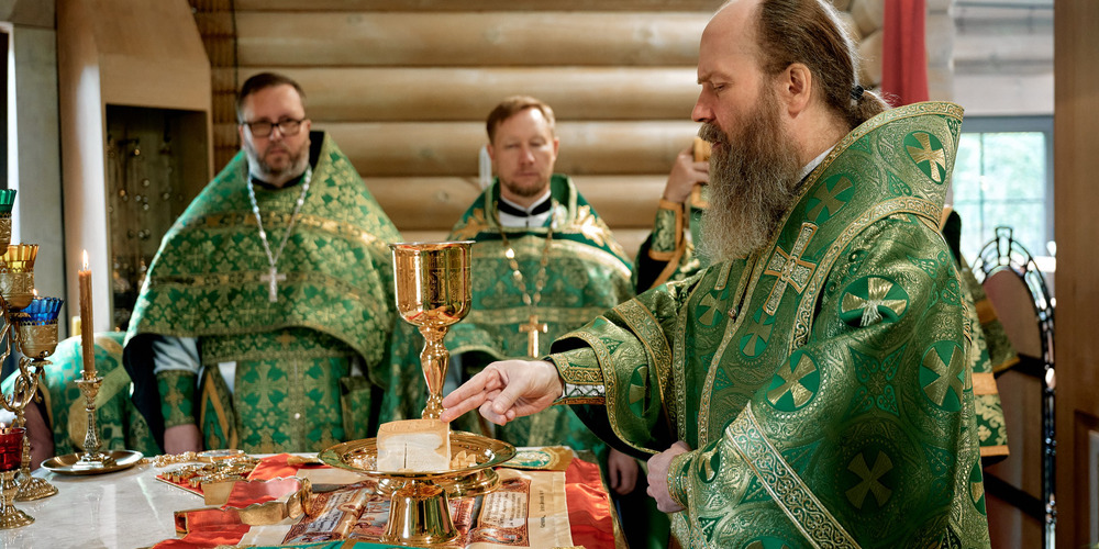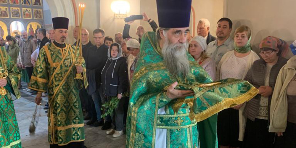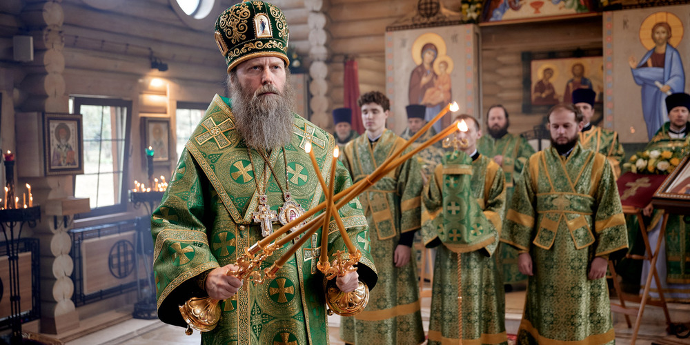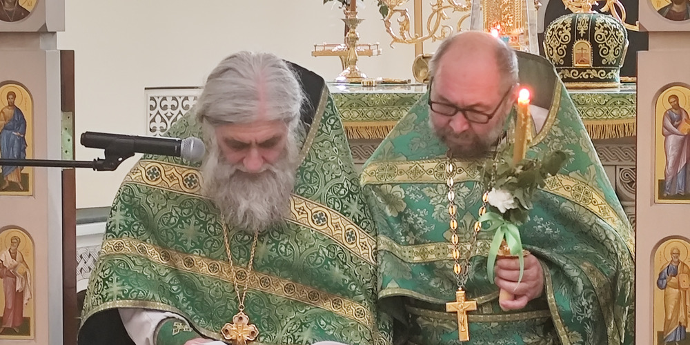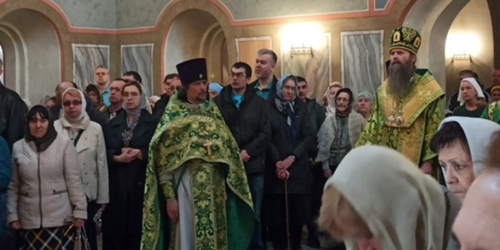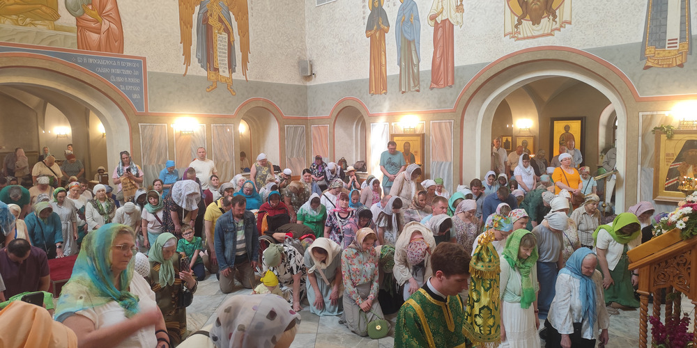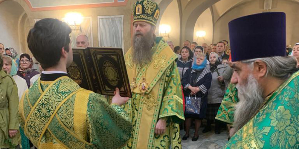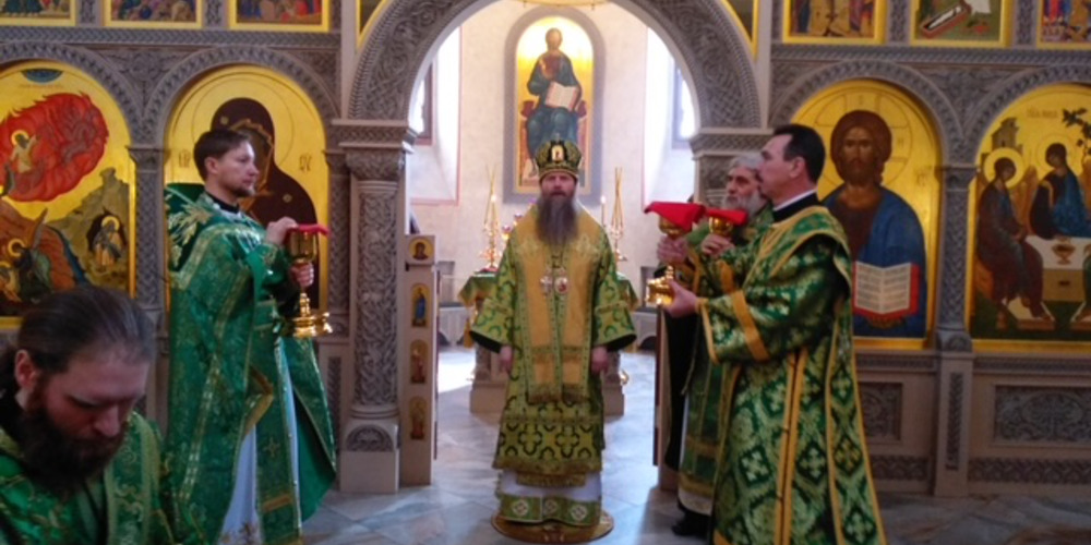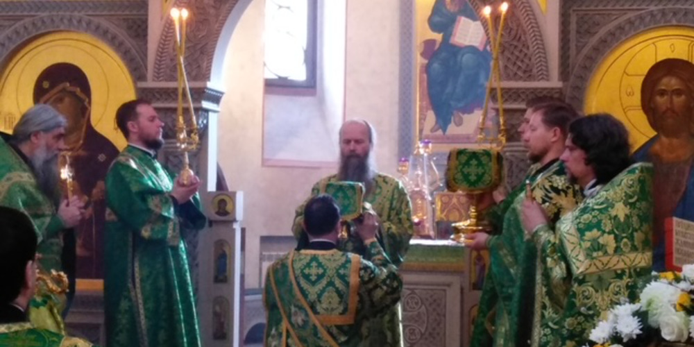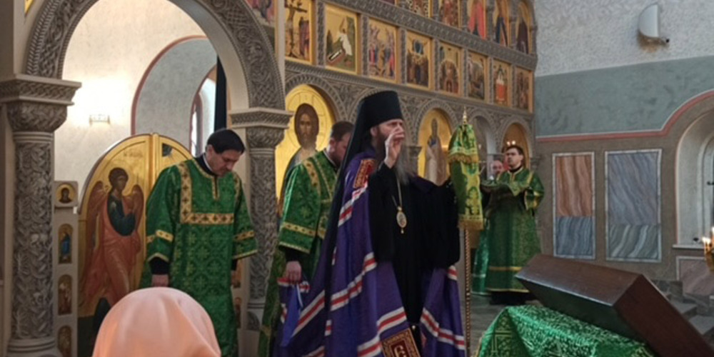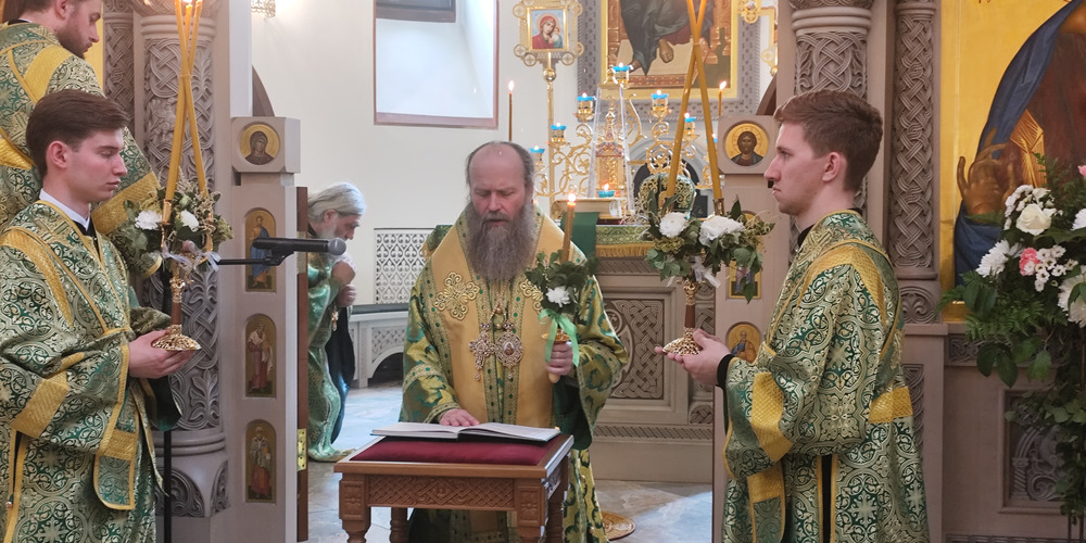 Затем владыка Силуан и сослужащие священники совершили великую вечерню праздника Пятидесятницы с чтением коленопреклонных молитв и Крестный ход.
