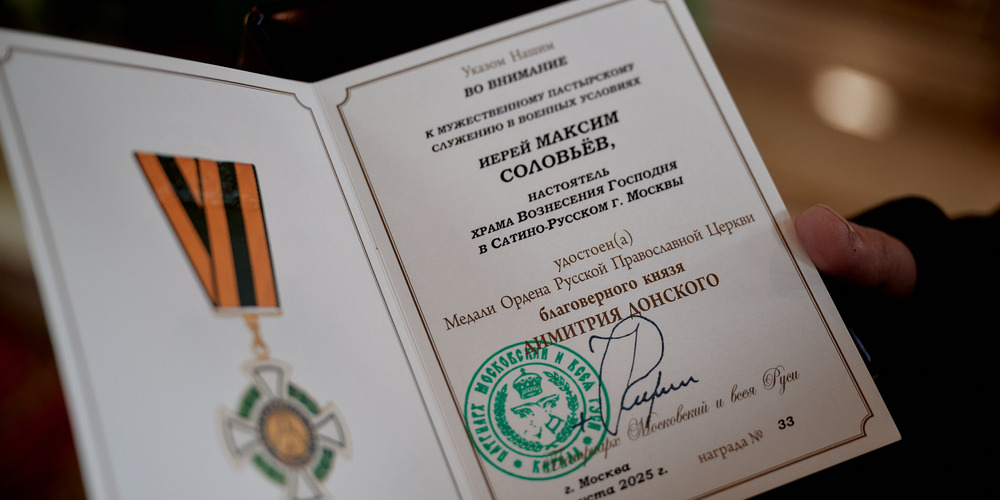 В конце богослужения архипастырь обратился к прихожанам с назидательным словом, а также указом Святейшего Патриарха Московского и всея Руси Кирилла во внимание к мужественному несению пастырского служения в военных условиях иерей Максим Соловьёв, настоятель храма Вознесения Господня в Сатино-Русском г.Москвы, удостоил Медали Ордена Русской Православной Церкви благоверного князя Димитрия Донского.
